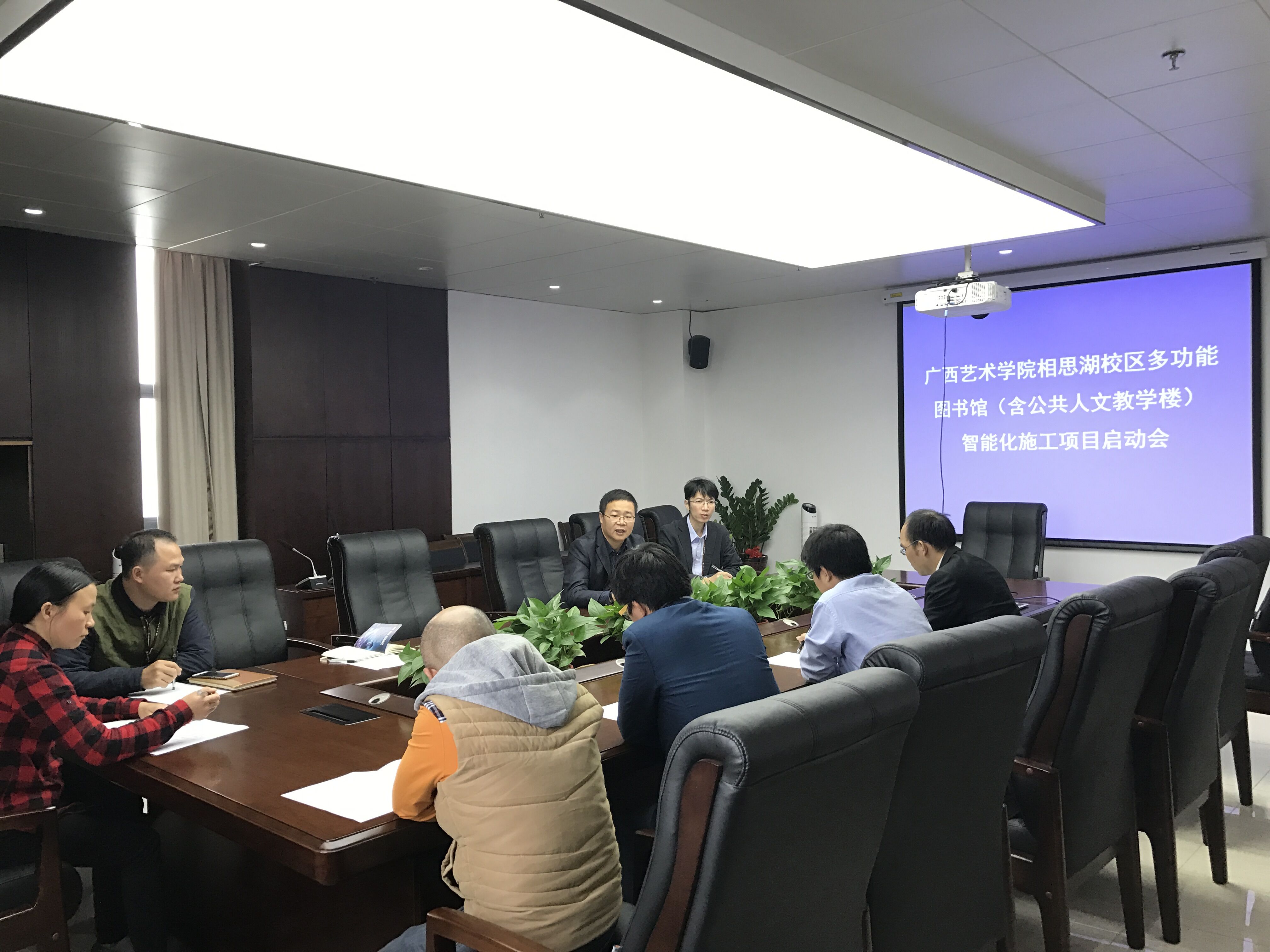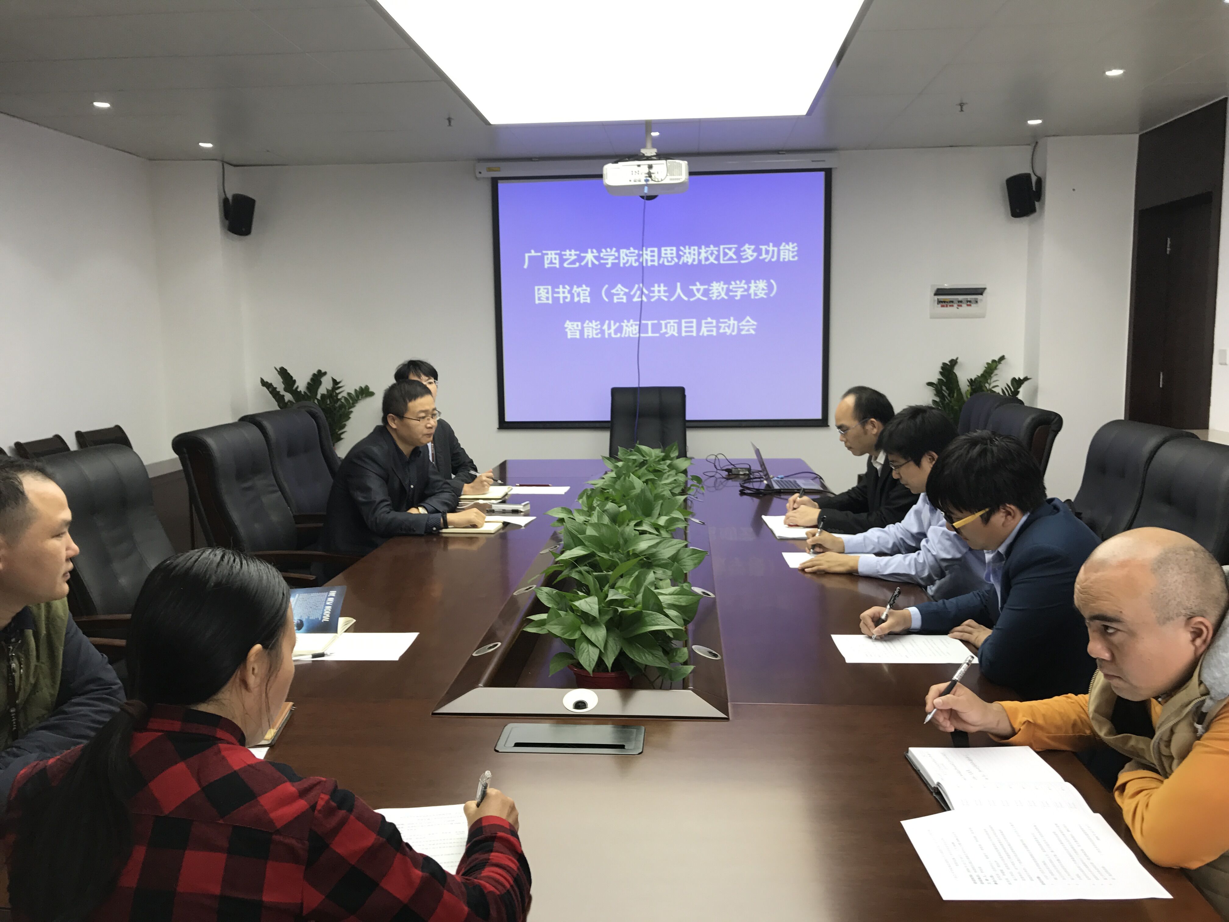 2016年12月13日上午10:00,明升体育88在南湖校区漓江画派艺术中心大楼1506会议室召开相思湖校区多功能图书馆(含公共人文教学楼)智能化工程项目启动会,学校宣传部(信息中心)负责人及有关同志、施工单位陕西北斗恒信科技发展有限公司项目组成员、监理单位南宁鸣发工程建设咨询有限公司项目组成员以及跟踪审计单位广西翔正项目管理有限公司项目组成员一同参加了会议。